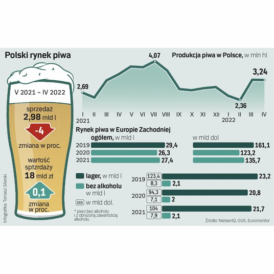 Według danych firmy Nielsen oraz GUS spada produkcja i sprzedaż piwa w porównaniu nawet ze słabym ubiegłym rokiem. Produkcja złocistego napoju w kwietniu 2022 zmniejszyła się w skali roku o 6,3 proc., a z miesiąca na miesiąc – o 0,4 proc. Pod względem sprzedaży w skali roku rynek skurczył się o 4 proc. Najbardziej zmniejszyła się sprzedaż lagera, mierzona w litrach spadła o 4 proc., choć wartość sprzedaży utrzymała minimalny wzrost o 0,1 proc. Mimo kryzysu ze sprzedażą wartą 18 mld zł piwo wciąż jest głównym graczem (44-proc. udział) szacowanego na 40 mld zł rynku alkoholi w Polsce – wynika z danych NielsenIQ.