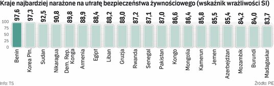 PIE zauważa, że w tej sytuacji szczególnego znaczenia nabrało pojęcie bezpieczeństwa żywnościowego. Instytut opracował syntetyczny wskaźnik wrażliwości (SI), dzięki któremu zidentyfikował kraje najbardziej narażone na zmniejszenie bezpieczeństwa żywnościowego ich mieszkańców. Przy wyznaczaniu wskaźnika brał pod uwagę wysokość PKB w danym kraju w przeliczeniu na mieszkańca, jego samowystarczalność w produkcji pszenicy, udział Ukrainy i Rosji w imporcie tego zboża, wreszcie udział zbóż i roślin okopowych w bilansie energetycznym mieszkańców. Maksymalna wartość wskaźnika to sto, a im wyższy on jest, tym niższe bezpieczeństwo żywnościowe danego kraju.