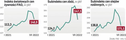 To, co dzieje się na światowych rynkach żywności, śledzi Organizacja Narodów Zjednoczonych ds. Wyżywienia i Rolnictwa (FAO). Po wybuchu wojny w Ukrainie, w marcu, wyznaczany przez nią indeks światowych cen żywności sięgnął 159,7 pkt. Wykonał gigantyczny skok aż o ponad 18 pkt, czyli o blisko 13 proc., w porównaniu z również rekordowym lutym. Znalazł się tym samym na najwyższym poziomie w historii notowań, czyli od 1990 r. Kwiecień, maj i czerwiec dość zaskakująco przyniosły lekkie spadki.