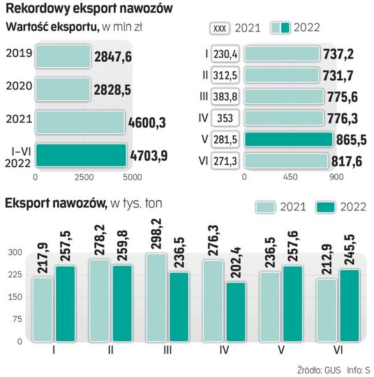 Przedstawiciele tych branż dopytują, czy ktokolwiek nad tym panuje – zwłaszcza że eksport nawozów w tym roku jest rekordowy, jego wartość w ciągu półrocza przewyższyła wynik całego 2021 r.