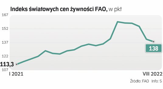 W marcu, zaraz po wybuchu wojny w Ukrainie, indeks FAO wystrzelił w górę: do 159,7 pkt. Wykonał gigantyczny skok aż o ponad 18 pkt, czyli o blisko 13 proc., w porównaniu z również rekordowym lutym. Znalazł się tym samym na najwyższym poziomie w historii, czyli od 1990 r. Kwiecień, maj i czerwiec, dość zaskakująco, przyniosły lekkie spadki. W lipcu ceny żywności spadły dość gwałtownie, bo o 13,3 pkt, czyli 8,6 proc. Sierpień te spadki pogłębił, choć raczej delikatnie. Pomimo tych spadków indeks FAO jest o 10,1 pkt (7,9 proc.) wyżej niż rok temu.