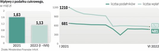 To zaskakuje, bo założenia są odwrotne: że producenci stopniowo uczą się „obchodzić” ten podatek, zastępują cukier słodzikami, by płacić mniej. Tymczasem coraz mniej jest płatników, a coraz większe wpływy: w styczniu 2021 r. podatek płaciło 681 firm, a w czerwcu 2022 r. 481.