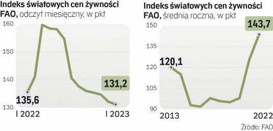 Powiew optymizmu ze światowych rynków żywności. To, co się na nich dzieje, śledzi Organizacja Narodów Zjednoczonych ds. Wyżywienia i Rolnictwa (FAO). Po wybuchu wojny w Ukrainie wyznaczany przez nią indeks światowych cen żywności sięgnął w marcu zeszłego roku 159,7 pkt. Wykonał gigantyczny skok aż o ponad 18 pkt, czyli o blisko 13 proc., w porównaniu z lutym. Znalazł się tym samym na najwyższym poziomie w historii notowań, czyli od 1990 r. Od marca jednak ceny żywności systematycznie spadają.