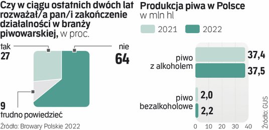 Kryzys w branży piwnej jest silny, choć dyskretny. Nie widać go na pierwszy rzut oka w wynikach sprzedaży w sklepach. Tu handel się trzyma, sprzedaż butelek piwa utrzymała w 2022 r. poziom z 2021 r. Jak obliczył Nielsen, wartość tego rynku wzrosła nawet o 10 proc., do 21 mld zł, jednak głównie w wyniku galopującej inflacji. CMR zauważa zaś, że o ile wynik z 2022 r. jest stabilny wobec 2021 – sprzedaż piwa straciła na objętości zaledwie 0,2 proc., to jednak w porównaniu do roku 2020 – widać już blisko 7 proc. spadku.