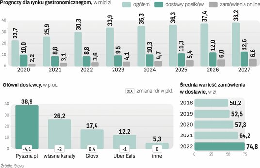 – Spodziewaliśmy się, że 2022 r. przyniesie znaczącą korektę na rynku i jego skurczenie pod względem wartości o ponad miliard złotych. Przewidywaliśmy, że delikatne odbicie nastąpi dopiero w 2023 r. Rozwój rynku w 2022 r. jednak zrewidował szacunki – mówi Paweł Aksamit, prezes Stavy. – W perspektywie pięcioletniej spodziewamy się pokonania poziomu 12,5 mld zł. Korekta naszych szacunków jest spowodowana przede wszystkim dynamicznie rosnącą średnią wartością zamówienia – dodaje, podkreślając, że w ciągu ostatnich lat odsetek Polaków, którzy regularnie zamawiają jedzenie w dowozie, znacząco wzrósł.