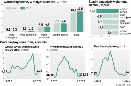 Której firmy badającej rynek by nie zapytać, wnioski są bardzo podobne – dla rynku alkoholi ubiegły rok łatwy nie był. Sprzedaż wódki czystej spadła aż o 12 proc., piwa o 6 proc. Mniejszą konsumpcję konsumenci mogli odczuć w głowach, ale na pewno nie w portfelach, bo na alkohol wydaliśmy jednak o 3 proc. więcej niż w analogicznym okresie ubiegłego roku – obliczył CMR. W browarach tli się jednak nadzieja na odbicie od dna. Najlepiej radzą sobie czarne konie polskiego rynku alkoholi, czyli piwa bezalkoholowe i wódki smakowe, co oznacza, że w modzie faktycznie jest ograniczanie alkoholu, bo nawet kolorowe „małpki” mają coraz mniej procentów.