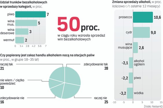 Z danych firmy wynika, że trend na bezalkoholowe trunki widać także w innych kategoriach. W przypadku wermutów to wzrost udziału o 1 pkt proc., a odpowiadają już za 2 proc. sprzedaży kategorii. Nieco wolniej rośnie znaczenie bezalkoholowych win deserowych, ale te już odpowiadają za 3 proc. wartości sprzedaży tych win.