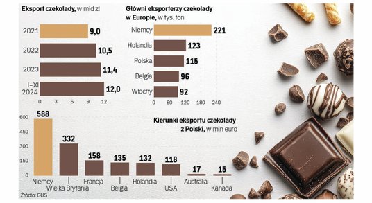 Wartość światowego eksportu czekolady i innych wyrobów zawierających kakao wyniosła w 2023 r. 35 mld euro i jak wynika z danych International Trade Center, Polska miała w tym 7-proc. udział. Największym odbiorcą polskich wyrobów czekoladowych są Niemcy oraz inne kraje unijne. Ale w czołówce są też Stany Zjednoczone, zyskują rynki, takie jak Kanada czy Australia.