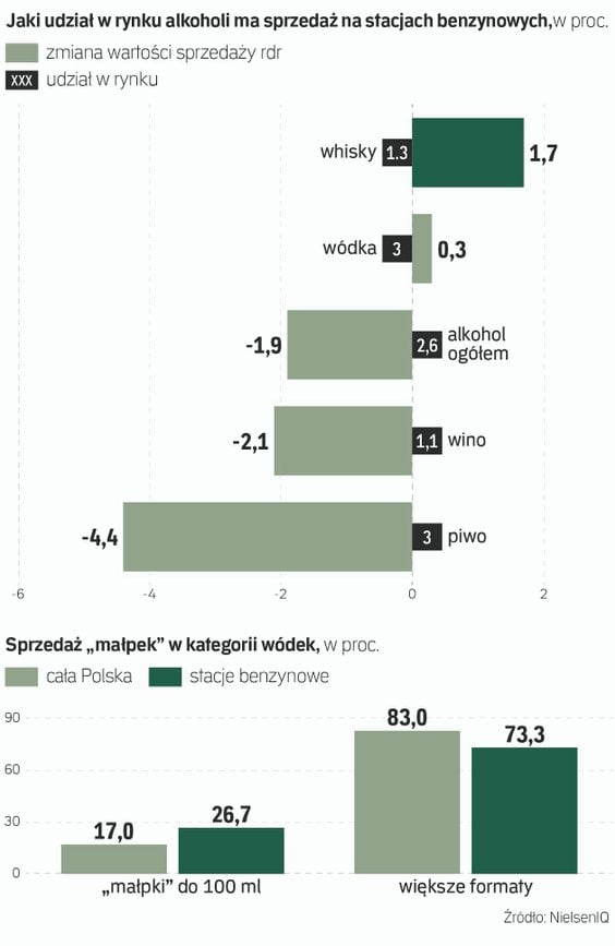 Klienci na stacjach wybierają najchętniej wódkę oraz piwo (3 proc. łącznej wartości ich sprzedaży w kraju dokonywana jest na stacjach benzynowych), znacznie rzadziej whisky (1,3 proc. wartości handlu) czy wina (1,1 proc.).