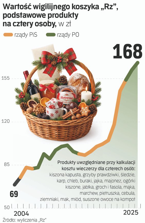 W tym roku za składniki do przygotowania tradycyjnej Wigilii na cztery osoby trzeba zapłacić 168 zł. To 3,7 proc. więcej niż rok temu. Dla porównania, ogólny wskaźnik inflacji to według danych GUS 2,5 proc. r/r (listopad 2025 r.). W badaniu cenowym wigilijnego koszyka „Rzeczpospolitej”, powstającym już od kilkunastu lat, bierzemy pod uwagę ceny tylko podstawowych produktów do samodzielnego przygotowania posiłku, bez półproduktów czy dań gotowych, które znacząco ułatwiają życie, ale też podnoszą ostateczny koszt.