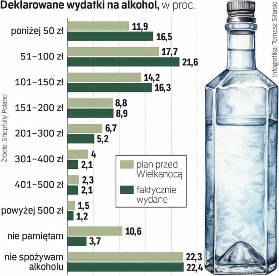 Wśród konsumentów, którzy przed świętami deklarowali wydanie wyższych kwot na trunki, widać z kolei spadki, często nawet niemal 50 proc., porównując faktycznie poniesione wydatki z zapowiedziami. – Wzrost udziału odpowiedzi w niższych kategoriach po Świętach może sugerować, że część respondentów finalnie wydała mniej, niż pierwotnie planowała. Różnica wskazuje na ostrożne podejście do tej kategorii zakupowej oraz na możliwość korygowania planów w dół w trakcie zakupów – mówi Robert Biegaj z Shopfully Poland. – Na uwagę zasługuje niemal identyczny odsetek osób, które nie wydały nic na alkohol lub go nie spożywały: 22,3 przed świętami i 22,4 proc. po ich zakończeniu. To pokazuje stabilność postaw. Decyzje o rezygnacji z alkoholu są najczęściej podejmowane wcześniej i nie ulegają zmianie pod wpływem atmosfery świątecznej – dodaje.