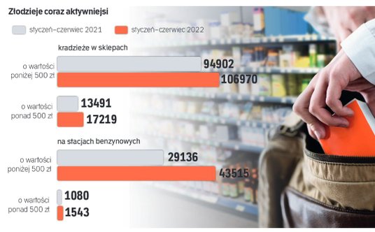 Od stycznia do czerwca doszło do 17 tys. 219 przestępstw kradzieży w sklepach – w tym samym okresie roku ubiegłego takich przypadków było 13 tys. 491. W samej Warszawie rok temu zanotowano 1815 kradzieży mienia znacznej wartości, teraz – już 2391. W okręgu krakowskim z 667 w ub.r. podskoczyło do 1016 zdarzeń, z terenu KWP Poznań z 774 do 1034. Kradzieże kwalifikowane jako wykroczenie wzrosły z 94 tys. 902 w ub.r. do 106 tys. 970 przypadków w tym roku (styczeń–czerwiec). Największy wzrost – blisko 600 przypadków więcej – odnotowano na terenie okręgu Rzeszowa i Lublina, na Śląsku, Pomorzu i Wielkopolsce – więcej o blisko 1,5 tys., a o 900 zdarzeń więcej w Łódzkiem.