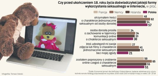 Aż 68 proc. wszystkich badanych przyznało, że doświadczyło co najmniej jednej z czterech rozważanych krzywd seksualnych online, przed ukończeniem 18. roku życia. 56 proc. z nich otrzymało przez internet jakieś treści o charakterze seksualnym od osoby dorosłej, 55 proc. było proszonych o zrobienie online czegoś o charakterze seksualnym, 33 proc. przesłano bez ich zgody treści o charakterze seksualnym, a 31 proc. przyznało, że dorośli, którzy nagabywali ich przez internet, prosili o zachowanie tego w tajemnicy.