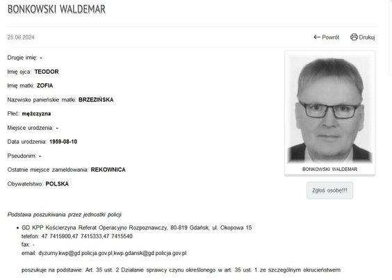 Za Waldemarem Bonkowskim został wysłany list gończy. Na stronie policji pojawił się także biogram ze zdjęciem mężczyzny. Byłego senatora PiS szuka Komenda Wojewódzka Policji w Gdańsku.