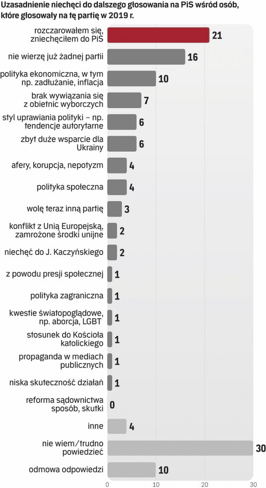 Sławomir Sierakowski i prof. Przemysław Sadura, socjolog z UW, przeanalizowali opinie obywateli pionowo i poziomo oraz wszerz i wzdłuż. W sondażu zapytano np. wyborców rozczarowanych do PiS, skąd w nich się wziął ten polityczny zawód po wyborach w 2019 roku. „Wśród konkretnych wyjaśnień dominują te odwołujące się do sytuacji materialnej wyborców – piszą autorzy raportu. – 10 proc. rozczarowanych wskazuje na błędy rządu w obszarze polityki ekonomicznej, skutkujące rosnącym długiem i inflacją. 7 proc. podkreśla to, że PiS nie wywiązuje się ze składanych obietnic (np. wobec opiekunów osób niepełnosprawnych). 6 proc. krytykuje zbyt duże i odbywające się ich kosztem wsparcie Ukraińców.