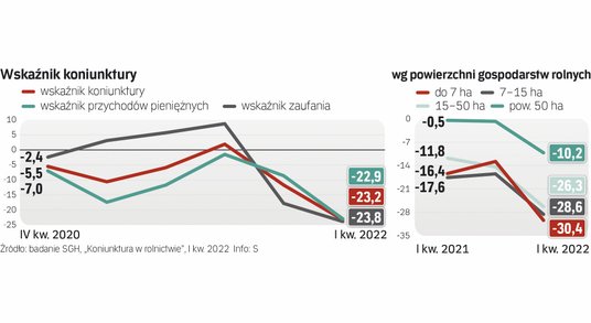 – Można mówić o głębokim kryzysie – mówi o wynikach I kw. 2022 r. dr Konrad Walczyk z SGH, autor badania koniunktury rolnej. Wskaźnik koniunktury rolnej jest średnią z ocen zmian przychodów pieniężnych gospodarstw rolnych i perspektyw rozwoju ich sytuacji ekonomicznej w najbliższym okresie. Tak dużych spadków wartości wskaźnika koniunktury czy wydatków na zakupy obrotowych środków produkcji nie notowano nigdy wcześniej w historii badania, które trwa od 1994 r. – Siła wstrząsu jest tej skali, co w okresie światowego kryzysu gospodarczego lat 2007–2009, lecz postępuje gwałtowniej – mówi Konrad Walczyk.