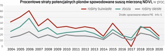 W raporcie PIE czytamy też, że przez wahania temperatur tracimy średniorocznie 7 proc. plonów, a co najmniej 14 proc. plonów będziemy tracili, jeśli średnia temperatura wzrośnie o 2 stopnie Celsjusza. W najtrudniejszych pod względem warunków pogodowych okresach traciliśmy ponad 50 proc.