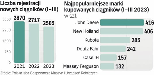 Doszło przy tym do zmiany na miejscu lidera sprzedaży. Po pierwszym kwartale 2023 r. to John Deere jest na czele. Zarejestrowano 416 ciągniki tej marki, to o 52 więcej niż przed rokiem. Udziały marki John Deere w ogólnej liczbie rejestracji nowych ciągników sięgały na koniec marca 16,6 proc. – o 3,2 pkt proc. więcej niż rok wcześniej. Marka New Holland z liczbą 406 ciągników zajmuje drugie miejsce. To o 98 mniej niż rok wcześniej. Udziały marki New Holland to 16,2 proc. – spadek o 2,3 pkt proc. Marka Kubota na trzecim miejscu zanotowała 285 zarejestrowanych maszyn. To o 27 mniej niż przed rokiem. Udziały tej marki wynoszą 11,4 proc. Na czwartym miejscu znalazła się marka Deutz Fahr. 242 zarejestrowane ciągniki to o 66 więcej niż przed rokiem. Deutz Fahr to 9,7 proc. udziałów rynkowych, o 3,2 pkt proc. więcej niż po trzech miesiącach 2022 r. Case IH zajmuje piąte miejsce. 157 zarejestrowanych maszyn pozwoliło na osiągnięcie 6,3 proc. udziałów rynkowych. Na 20. miejscu w tym zestawieniu znalazła się marka Ursus z jednym zarejestrowanym nowym ciągnikiem.