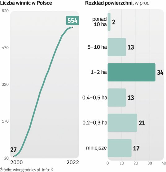 Jeszcze w roku winiarskim 2012/2013 zarejestrowanych było 35 wytwórców wina, dekadę później jest ich ponad dziesięć razy więcej – wynika z danych Krajowego Ośrodek Wsparcia Rolnictwa. Branżowe portale, takie jak winogrodnicy.pl, podają, że winnic jest jeszcze więcej – niemal 600, choć nie wszystkie muszą produkować wino. Dominują te mniejsze, ponaddziesięciohektarowych jest tylko 2 proc.
