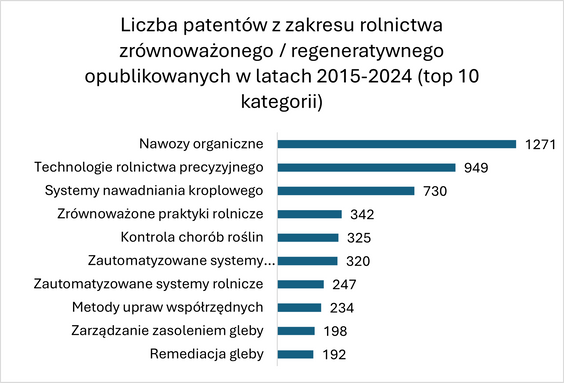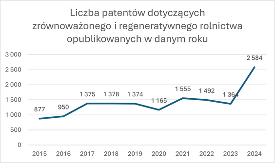 Analiza danych patentowych wyraźnie wskazuje dynamiczny wzrost innowacyjnych rozwiązań w dziedzinie rolnictwa zrównoważonego i regeneratywnego. Jest on szczególnie zauważalny w ostatnich latach, ze szczytem w 2024 r., kiedy to liczba opublikowanych patentów sięgnęła 2584 dokumentów, niemal dwukrotnie przewyższając poprzednie lata. Wśród najważniejszych obszarów innowacji wyróżniają się organiczne nawozy (1271 patentów), technologie precyzyjnego rolnictwa (949 patentów) oraz systemy nawadniania kroplowego (730 patentów).