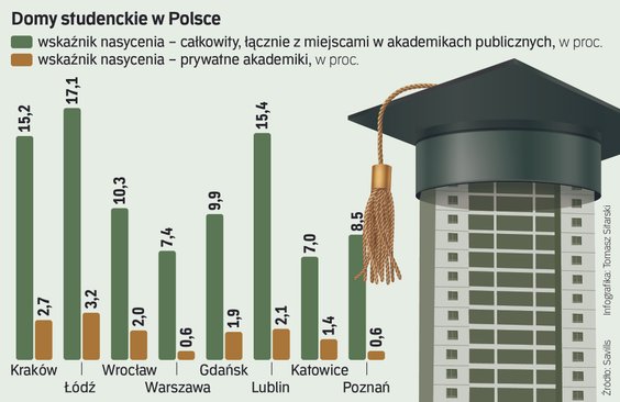 W Polsce jest ponad 1,2 mln studentów (105 tys. to studenci zagraniczni) uczących się na 359 uczelniach. Jak szacuje firma doradcza CBRE, na miejsce w uczelnianym akademiku może liczyć mniej niż 10 proc. studentów. – Uwzględniając prywatne akademiki, wskaźnik zbliży się do 11 proc. – szacuje Agnieszka Mikulska, ekspertka CBRE.