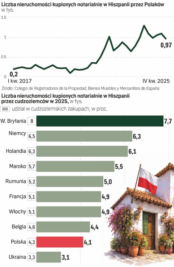 Pełne sprawozdanie Registradores de España (organ rejestrowy odpowiedzialny za prowadzenie rejestrów prawnych, w tym m.in. rejestru nieruchomości i działalności gospodarczej) za 2025 r. przynosi szczegóły aktywności Polaków na hiszpańskim rynku mieszkaniowym.