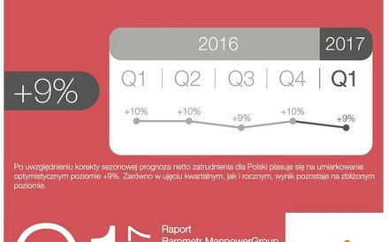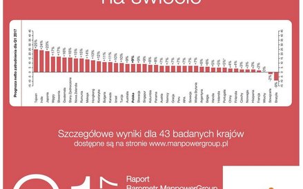 Jak wynika z badań, co ósmy (12 proc.) z 750 badanych w Polsce pracodawców planuje w I kw. 2017 r. zwiększyć liczbę pracowników. To nieco więcej niż rok wcześniej (11 proc.), ale porównanie z końcówką br. (15 proc.) dowodzi schłodzenia rekrutacyjnych nastrojów w firmach. Wzrósł też nieco odsetek pracodawców myślących o cięciu zatrudnienia (do 8 proc. z 6 proc. rok wcześniej).