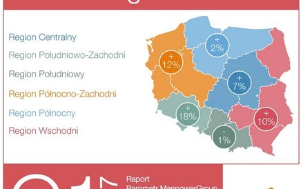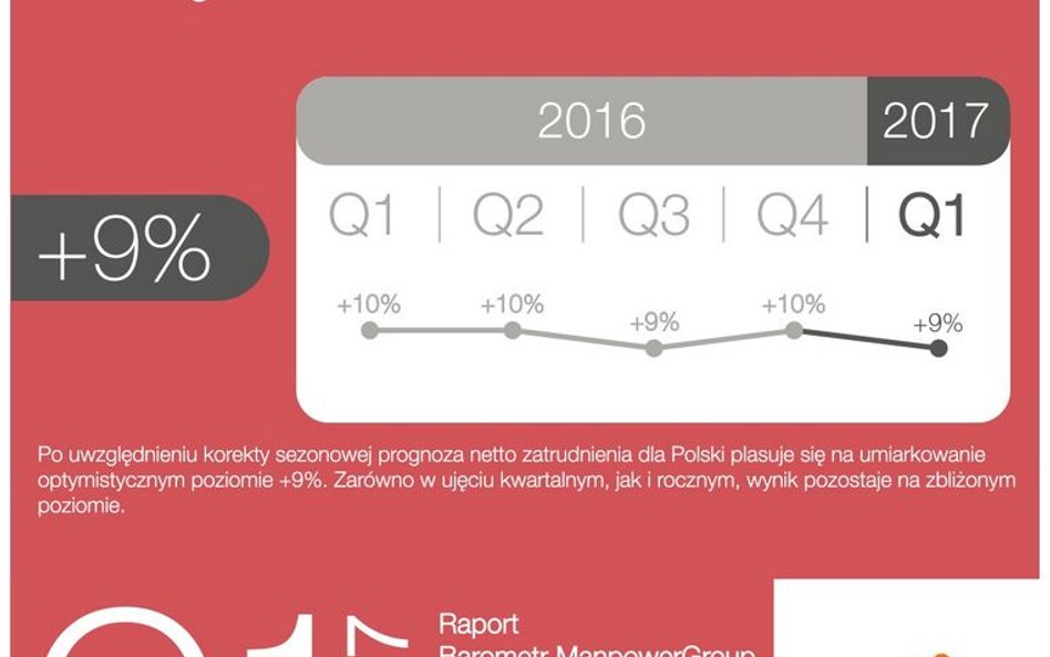 Jednak i tak obliczana przez ManpowerGroup prognoza netto zatrudnienia po korekcie sezonowej jest na sporym plusie (9 pkt proc.), dowodząc umiarkowanego optymizmu polskich firm. Najwięcej jest go w budownictwie i w przemyśle. Z kolei w kopalniach, energetyce oraz finansach więcej firm chce ciąć zatrudnienie, niż je zwiększać.