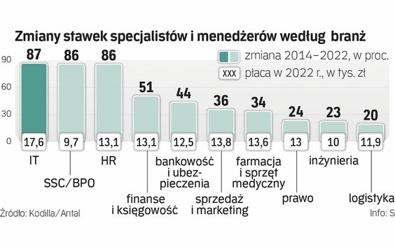 Podczas gdy przeciętne wynagrodzenie w sektorze przedsiębiorstw wzrosło w tym czasie o dwie trzecie (do 6,1 tys. zł brutto), średnie stawki profesjonalistów w IT poszły w górę o 87 proc. To najszybszy wzrost na tle pozostałych specjalizacji, chociaż dwie z nich notowały podobne tempo podwyżek; płace specjalistów w centrach usług biznesowych (SSC/BPO) oraz w HR wzrosły w tym czasie o 86 proc.