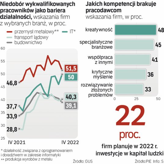 O ile w kwietniu 2021 r. w badaniu koniunktury GUS nieco ponad jedna trzecia firm z branży IT wśród barier w swej działalności wskazywała niedobór wykwalifikowanych pracowników, o tyle teraz, rok później, udział takich wskazań sięgnął rekordowego poziomu 50 proc., największego w usługach.