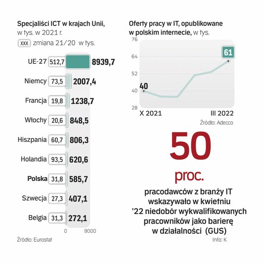 Jednak biorąc pod uwagę odsetek specjalistów ICT wśród ogółu pracowników, nasz kraj z zaledwie 3,5-proc. udziałem pozostaje daleko za unijną czołówką i sporo poniżej średniej w UE, która w zeszłym roku wzrosła do 4,5 proc. Chociaż największym w Unii rynkiem pracy w IT są Niemcy, które w 2021 r. miały ponad 2 mln specjalistów ICT (o ponad 73 tys. więcej niż rok wcześniej), to pod względem ich udziału w zatrudnieniu liderem jest Szwecja. W zeszłym roku niemal co dziesiąty pracownik (8 proc.) był tam specjalistą IT. Kolejne miejsca zajęły Finlandia i Luksemburg, które mają odpowiednio 7,4 proc. i prawie 7 proc. odsetek informatyków na rynku pracy.