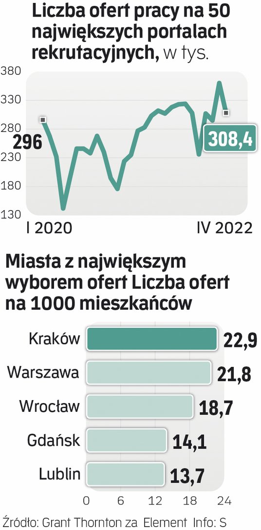Maciej Michalewski mówi o pierwszych symptomach wyhamowania rekrutacyjnego boomu, który podbijał wyniki pierwszego kwartału 2022 r. Według niego może być to efektem napływu na rynek pracy uchodźców z Ukrainy, którzy skokowo podnieśli liczbę kandydatów. A to w naturalny sposób ograniczyło liczbę ofert publikowanych przez pracodawców – część ogłoszeń w ogóle się nie pojawia na portalach rekrutacyjnych, bo firmy w niektórych branżach mogły obsadzić wakaty już bez dodatkowych publikacji ogłoszeń. – Na razie jednak ofert pracy nadal jest więcej niż kandydatów – zaznacza Michalewski.