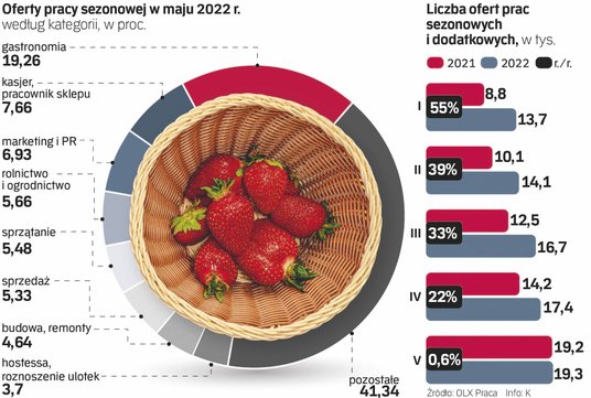 – Pracodawcy w gastronomii są zdesperowani. Podwyższamy stawki, a i tak nie ma chętnych do pracy – twierdzi Jacek Czauderna, restaurator i prezes Izby Gospodarczej Gastronomii Polskiej. Firmy wypełniają część wakatów uchodźcami z Ukrainy, ale barierą, która to ogranicza, jest brak znajomości polskiego. Według udostępnionych „Rzeczpospolitej” danych serwisu OLX Praca to na gastronomię przypadało najwięcej (prawie jedna piąta) z opublikowanych tam w maju ofert prac sezonowych.