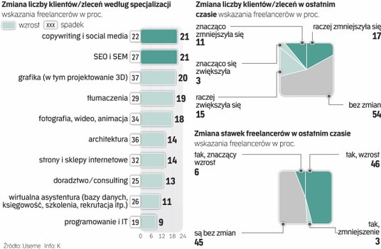 Niemniej jednak w czasach pogorszenia koniunktury firmy często ograniczają zewnętrzne usługi, szczególnie w takich obszarach jak marketing i reklama czy konsulting. Zdaniem szefa Useme.com może to być teraz przyczyną spadku liczby zleceń, notowanego przez ponad jedną trzecią freelancerów zajmujących się grafiką, fotografią czy animacją (choć np. co piąty grafik mówi o wzroście zamówień).