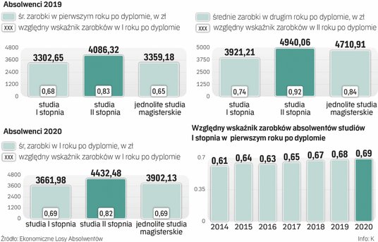 Osoby kończące studia w 2020 r. miały dużo lepszy start na rynku pracy niż absolwenci uczelni z wcześniejszych roczników, w tym szczególnie ci z rocznika 2019. Jednak oni również skorzystali w zeszłym roku na silnym odbiciu w gospodarce wspieranym przez kolejne „tarcze” i znoszeniu ograniczeń covidowych – wynika z udostępnionych „Rzeczpospolitej” wyników siódmej już edycji ogólnopolskiego monitoringu Ekonomicznych Losów Absolwentów szkół wyższych (ELA), którą na zlecenie Ministerstwa Edukacji i Nauki (MEiN) prowadzi Ośrodek Przetwarzania Informacji – Państwowy Instytut Badawczy (OPI-PIB).