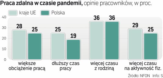 Jednak jedni i drudzy jeszcze częściej niż wzrost ilości obowiązków dostrzegają zmiany, które zwykle uważa się za atuty home office; 36 proc. wszystkich badanych w Europie, w tym w Polsce (w Portugalii jeszcze więcej, bo ponad 41 proc.), ocenia, że spędzają teraz więcej czasu z rodziną. Prawie trzech na dziesięciu zdalnych pracowników przyznaje, że ma teraz więcej czasu na aktywność fizyczną.