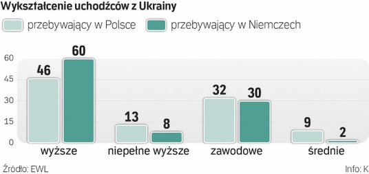 Słabiej wypadają tu Niemcy, gdzie według czerwcowego badania ifo Institute tylko połowie Ukraińców udało się znaleźć pracę. I to pomimo tego, że są lepiej wykształceni niż ci w Polsce. Według badania EWL Group, które latem tego roku objęło po 400 ukraińskich uchodźców pracujących w Polsce i w Niemczech, 59 proc. uchodźców w naszym kraju ma wyższe wykształcenie, przy czym 13 proc. niepełne wyższe. Natomiast wśród Ukraińców za Odrą aż 68 proc. jest po studiach (60 proc. po pełnych). Lepiej też znają angielski: 53 proc. włada nim na poziomie komunikatywnym, tymczasem w Polsce – co trzeci.