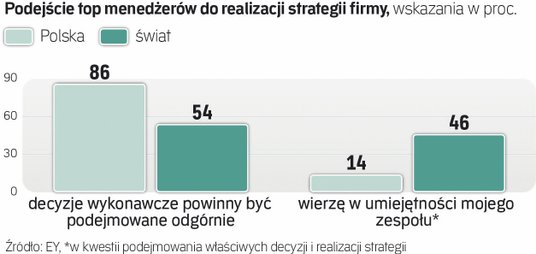 – Widać wyraźnie, że polscy top menedżerowie wciąż tkwią w epoce, w której królowało ręczne sterowanie firmą i nadal mają opory przed większym delegowaniem decyzyjności na pracowników niższych szczebli – komentuje wyniki badania Arkadiusz Gęsicki, partner odpowiedzialny za działalność EY-Parthenon w Polsce i krajach bałtyckich, a także lider EY-Parthenon w regionie CESA. (EY-Parthenon zajmuje się doradztwem strategicznym).