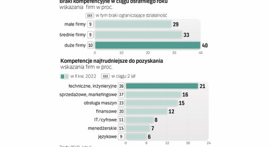Niemal co trzeci z badanych odczuł w ciągu ostatniego roku braki kompetencji w swoich strukturach (przy czym w co dziesiątej firmie ograniczało to możliwości rozwoju), a wśród dużych pracodawców niedobory potrzebnych umiejętności dotknęły aż 40 proc. badanych. To oni też najczęściej (37 proc.) narzekają na problemy z pozyskaniem kompetencji technicznych i inżynieryjnych, które w tym roku awansowały na czoło listy deficytowych umiejętności.