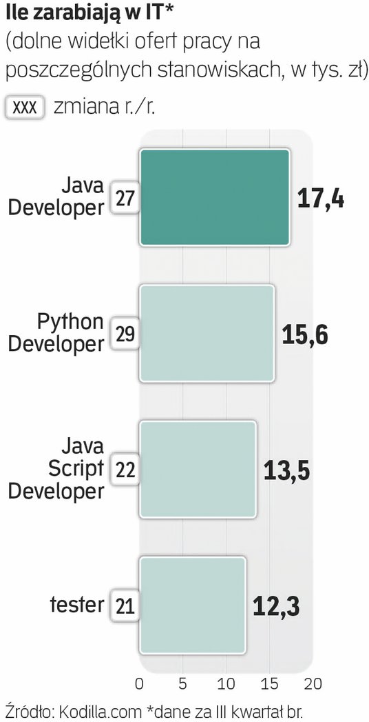 IT to jedna z tych branż, w których odpowiedzią na rosnącą inflację są rosnące pensje. Jak wynika z danych Just Join IT, rok do roku notowane są wzrosty płac rzędu 11–40 proc. i to mimo coraz mocniej zarysowującego się kryzysu. Specjaliści z tego sektora są jednak w korzystnej sytuacji negocjacyjnej, gdyż branża od lat cierpi na niedobór wykwalifikowanych kadr. Analitycy z Kodilla.com wskazują, że wyższa o kilkanaście czy nawet kilkadziesiąt procent pensja oferowana przez potencjalnego pracodawcę, to dziś bardzo dobry motywator do zmiany miejsca zatrudnienia.
