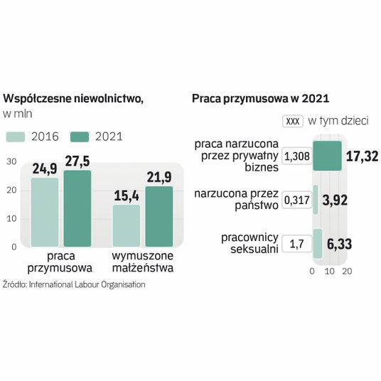Takich przykładów może być niestety coraz więcej – bo na świecie w ciągu kilku ostatnich niespokojnych lat bardzo przybyło niewolników. Międzynarodowa Organizacja Pracy (ILO) szacuje we wrześniowym raporcie, że liczba osób żyjących i pracujących w warunkach przymusu sięga już 49,5 mln, a co najbardziej niepokojące – od 2016 r. wzrosła o 9 mln ludzi. To tyle, ile wynosi populacja Węgier. Przymusowo pracuje dziś 27,5 mln ludzi (o 2,6 mln więcej niż przy ostatnim badaniu ILO), a grono osób zmuszonych do małżeństwa powiększyło się o 6,5 mln i liczy już 22 mln ludzi, z czego 8 mln to dzieci. ILO dzieli pracowników przymusowych na tych zniewolonych przez biznes prywatny (17,3 mln), przymuszanych do pracy przez państwa, w tym więźniów (4 mln), i ocenia, że 6,3 mln osób to przymusowi pracownicy seksualni, z czego aż 1,7 mln to dzieci.