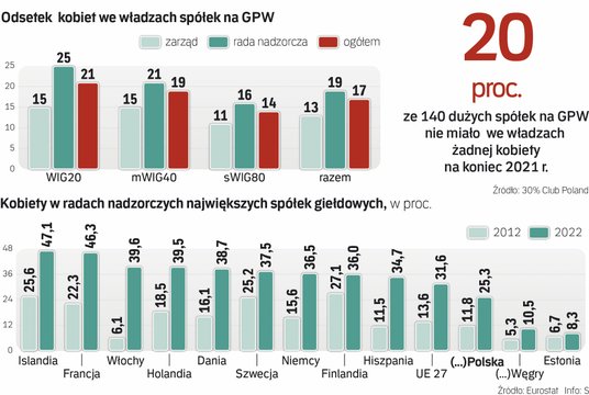 Według jej danych na koniec minionego roku kobiety stanowiły 16,6 proc. członków zarządów i rad nadzorczych 140 największych spółek wchodzących w skład głównych indeksów warszawskiej giełdy (WIG20, WIG40 i sWIG80). Było to wprawdzie o 1,1 pkt proc. więcej niż rok wcześniej, ale nadal co piąta spółka nie miała we władzach ani jednej kobiety. W przypadku zarządów aż w 61 proc. spółek były one wyłącznie męskie.