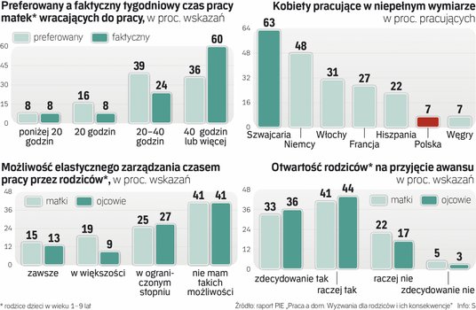 Z kompleksowych badań przedstawionych w raporcie wynika m.in., że mimo pewnych zmian kulturowych, jednak kobiety wciąż odgrywają kluczową rolę w wychowywaniu dzieci, i to na nie spada większość obowiązków. To ważne, bo wyjaśnia przyczyny większej bierności zawodowej młodych mam niż młodych ojców i bariery w rozwoju zawodowym kobiet.