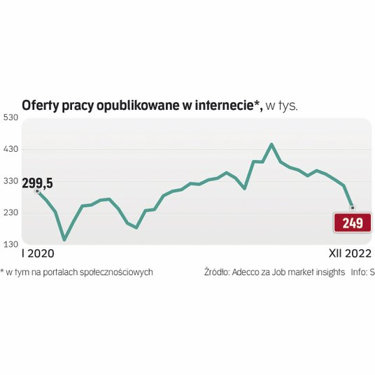 Tylko 249 tys. ofert opublikowano w grudniu na portalach rekrutacyjnych i w mediach społecznościowych w Polsce. To o ponad 58 tys. mniej niż rok wcześniej i niemal 200 tys. mniej niż rekordowym marcu 2022 r. – wynika z analizy agencji zatrudnienia Adecco Group i firmy Job Market Insights, którą „Rzeczpospolita” opisuje jako pierwsza.