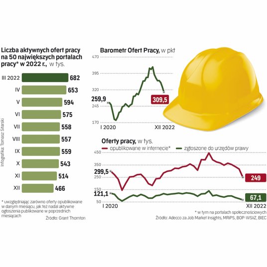 Autorzy BOP, Robert Pater i Herman Cherniaiev z WSIiZ, zwracają uwagę, że, po wyłączeniu ofert o charakterze sezonowym, we wszystkich regionach grudzień przyniósł spadek liczby ogłoszeń, zarówno w porównaniu z listopadem 2022 r., jak też ostatnim miesiącem poprzedniego roku. – W końcu ubiegłego roku spadki ogłaszanych w internecie wakatów miały już powszechny charakter, obejmując wszystkie województwa i kategorie ogłoszeń o pracę – twierdzą Pater i Cherniaiev.