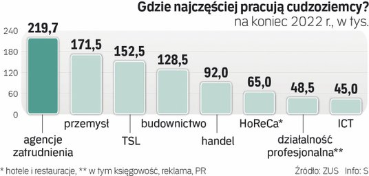 W rzeczywistości, w tych sektorach może pracować jeszcze więcej migrantów kierowanych tam przez agencje zatrudnienia, które najczęściej rekrutują pracowników do przemysłu, TSL i handlu. Agencje zatrudnienia (klasyfikowane jako działalność w zakresie usług administrowania i działalność wspierająca) miały również w zeszłym roku największy, ponad 20-proc., udział wśród zgłoszonych do ZUS obcokrajowców. Ich liczba wzrosła na koniec grudnia do 1,063 miliona osób, czyli o ponad jedną piątą w porównaniu z końcem 2021 r.