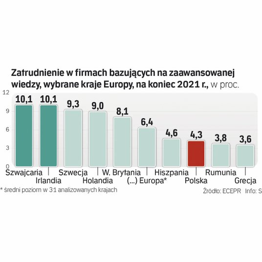 – Te trzy części gospodarki to sektory o dużej wartości dodanej. Z naszych ustaleń wynika, że region, w którym odsetek zatrudnionych w przedsiębiorstwach o wysokim stopniu zaawansowania wiedzy przekracza o co najmniej 10 punktów procentowych średnią europejską, ma średnio o 2,2 procent niższe bezrobocie – zaznacza dr Nima Sanandaji, dyrektor ECEPR. Jak wynika z raportu think tanku, w czołówce państw z największym udziałem miejsc pracy w zawodach opartych na wiedzy ten odsetek sięga 10,1 proc., czyli sporo powyżej europejskiej średniej (6,4 proc. na koniec 2021 r.).
