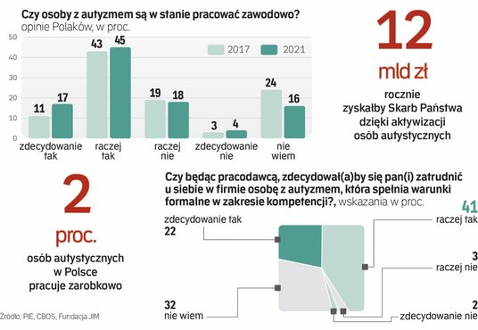 Na jej zawodowy i gospodarczy potencjał zwraca uwagę ubiegłoroczny raport Polskiego Instytutu Ekonomicznego „Droga do otwarcia rynku pracy w Polsce dla osób autystycznych”. Jego autorzy szacują, że – przyjmując umiarkowany scenariusz – aktywizacja zawodowa osób w spektrum autyzmu zapewniłaby w kolejnych latach średnio prawie 12 mld zł dodatkowych dochodów budżetu, zwiększając o 17 mld zł nasz PKB.