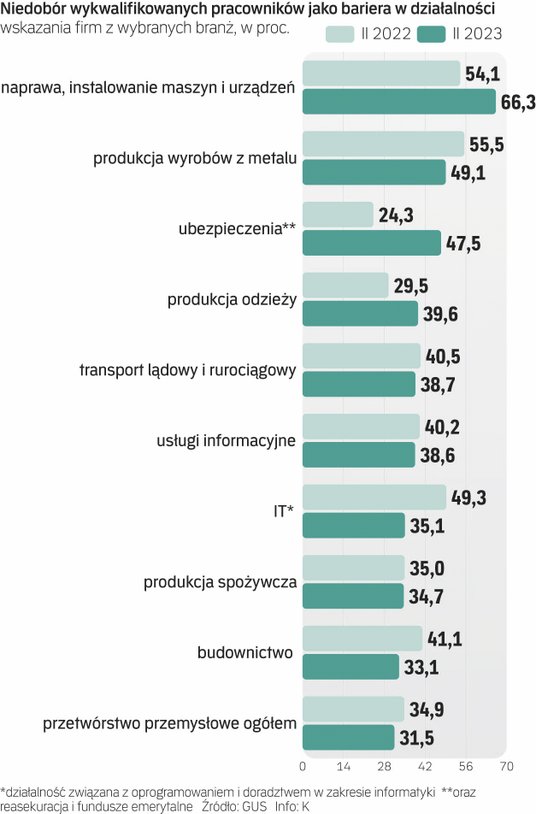 Z kolei według danych GUS w części branż problem bariery kadrowej jest teraz większy niż przed rokiem. W tej sytuacji jest np. branża ubezpieczeniowo-reasekuracyjna, wraz z funduszami emerytalnymi, gdzie obecnie deficyt wykwalifikowych kadr utrudnia działalność ponad 47 proc. firm. To niemal dwukrotnie więcej niż w lutym ub.r.