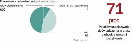 Wśród pracowników biurowych doświadczenia we współpracy z cudzoziemcami są nieco rzadsze (56 proc.), choć w ostatnich latach sprzyja im zarówno umiędzynarodowienie polskich firm, jak też rozwój sektora nowoczesnych usług biznesowych (BSS). Według danych Związku Liderów Sektora Usług Biznesowych (ABSL) cudzoziemcy stanowią około 14 proc. pracowników tej branży zatrudniającej już ponad 400 tysięcy osób. Wiele z nich na co dzień współpracuje też z obcokrajowcami zdalnie, bo zdecydowana większość centrów BSS działa na międzynarodową, nierzadko globalną, skalę.